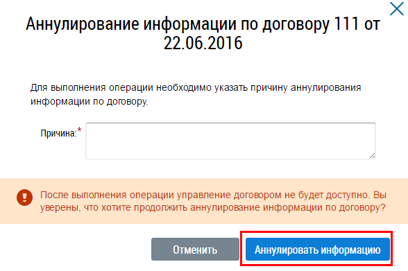 В отобразившемся окне Аннулирование информации по договору заполните поле Причина и нажмите на кнопку Аннулировать информацию.