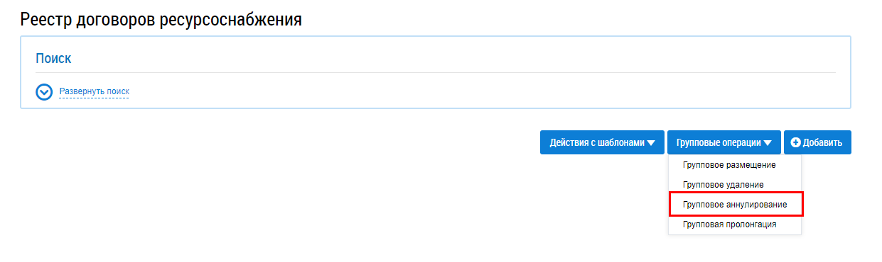 Система также предоставляет возможность произвести групповое аннулирование договоров. Для этого нажмите на кнопку Групповые операции на странице Реестр договоров ресурсоснабжения и выберите пункт контекстного меню Групповое аннулирование.