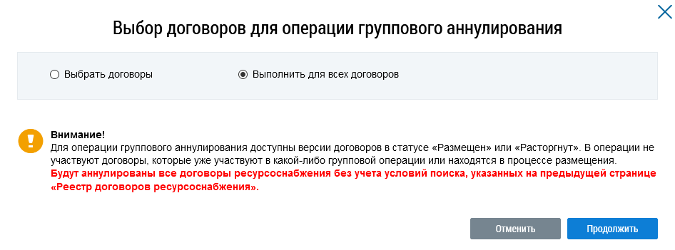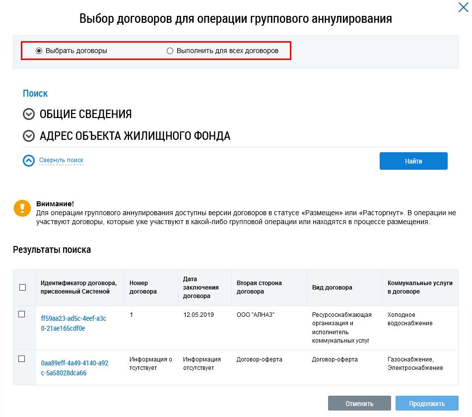 Для удаления определенных договоров установите переключатель напротив варианта Выбрать договоры и воспользуйтесь блоком поиска. В списке результатов поиска установите флажок в строки с договорами, которые необходимо аннулировать. Затем нажмите кнопку Продолжить.