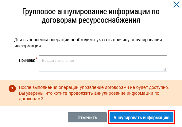 В отобразившемся окне Групповое аннулирование информации по договорам ресурсоснабжения заполните поле Причина и нажмите на кнопку Аннулировать информацию.