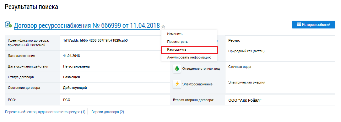 Чтобы расторгнуть договор ресурсоснабжения, выберите пункт Расторгнуть контекстного меню сведений о договоре.