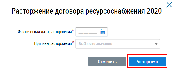 Отображается окно Расторжение договора ресурсоснабжения.