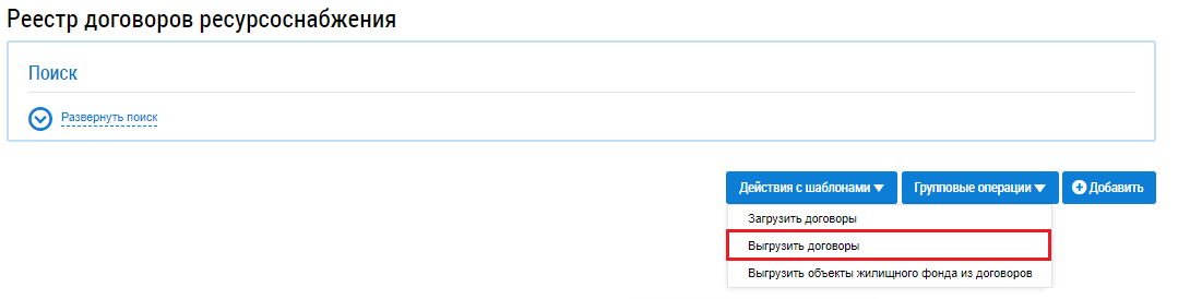 Чтобы выгрузить на компьютер информацию о договорах ресурсоснабжения, нажмите на кнопку Действия с шаблонами на странице Реестр договоров ресурсоснабжения и выберите пункт Выгрузить договоры.