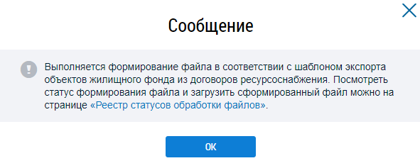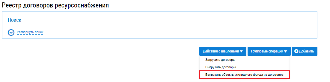 Чтобы выгрузить на компьютер информацию об объектах жилищного фонда из договоров ресурсоснабжения, нажмите на кнопку Действия с шаблонами на странице Реестр договоров ресурсоснабжения и выберите пункт Выгрузить объекты жилищного фонда из договоров.