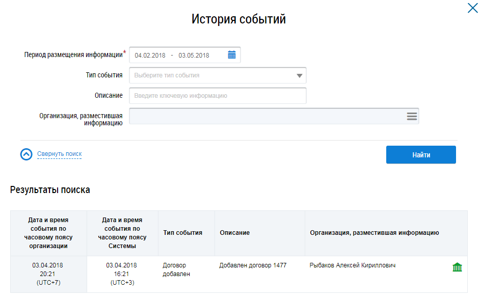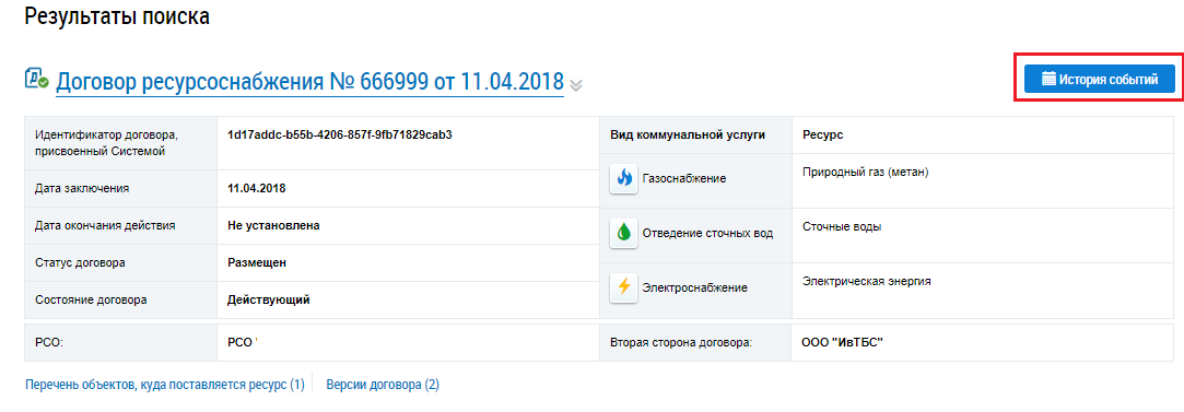 Для просмотра истории событий договора необходимо нажать на кнопку История событий в блоке сведений о договоре.