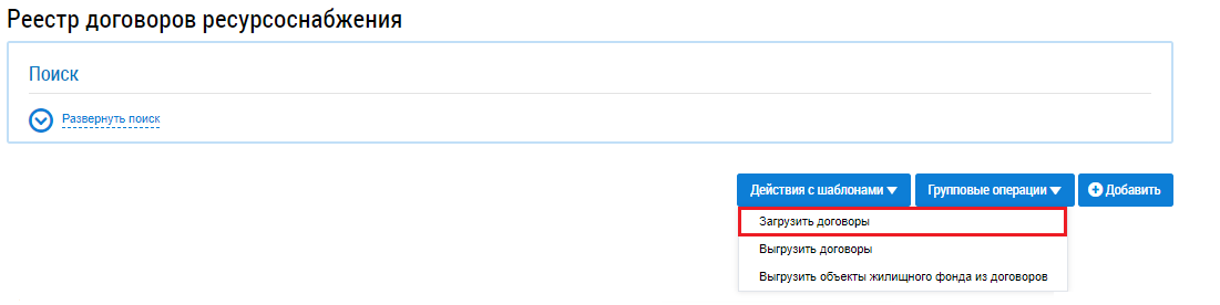 Для загрузки сведений о договорах ресурсоснабжения необходимо нажать на кнопку Действия с шаблонами на странице Реестр договоров ресурсоснабжения, затем на пункт контекстного меню Загрузить договоры.