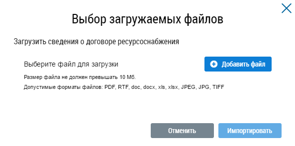 Нажмите на кнопку Добавить файл, выберите необходимый файл для импорта и нажмите на кнопку Импортировать. В случае отсутствия нарушений файл со сведениями загружается, форма импорта сведений закрывается и отображается сообщение об успешной обработке файла. Обращаем внимание, что если выгрузка договоров уже существует, то повторный запуск возможен после завершения текущего процесса.