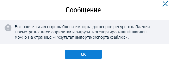 Для загрузки на компьютер списка договоров ресурсоснабжения нажмите на пункт контекстного меню Выгрузить договоры. Отобразится информационное сообщение.