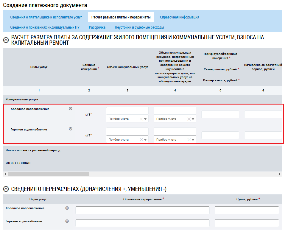 Заполните обязательные поля и перейдите на вкладку Расчет размера платы и перерасчеты.