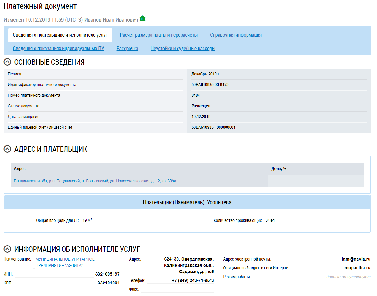 Отображается страница со сведениями о платежном документе на вкладке Сведения о плательщике и исполнителе услуг.