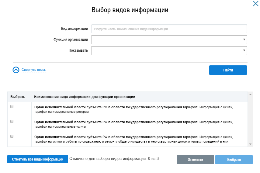 Установите флажок в поле необходимого вида информации и нажмите на кнопку Выбрать. При необходимости выбора всех видов информации нажмите на кнопку Отметить все виды информации.