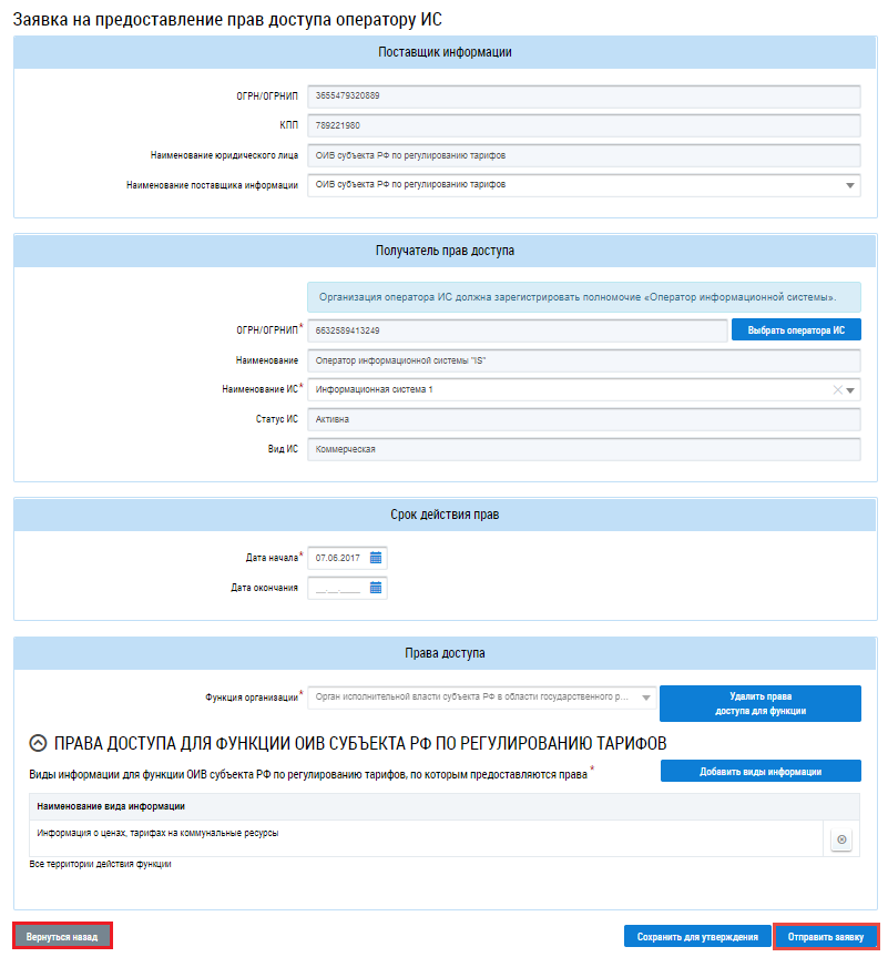 - руководителю организации - с возможностью сохранения заявки и отправки заявки Оператору ИС;