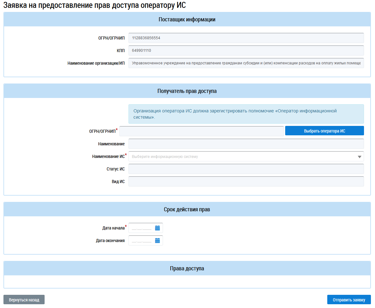 Отображается страница добавления заявки на предоставления прав доступа оператору ИС.
