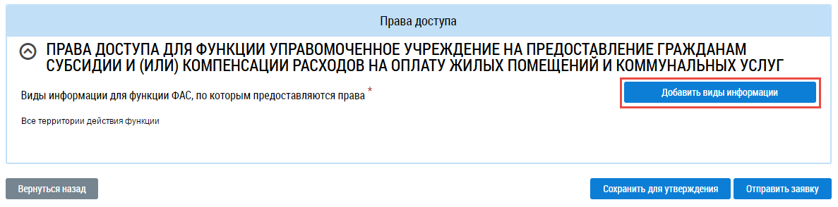 Укажите виды информации, по которым предоставляются права. Для добавления видов информации нажмите на кнопку Добавить виды информации.