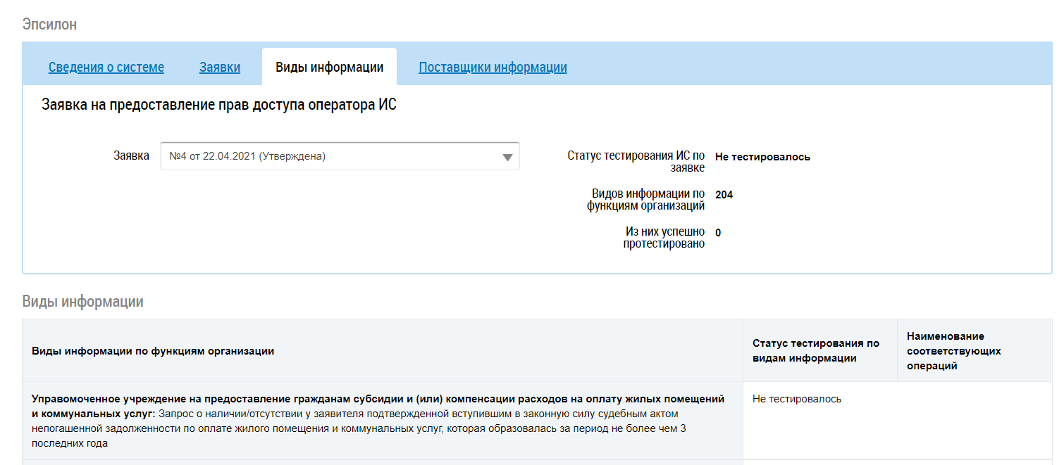 Вкладка Виды информации содержит сведения о тестировании ИС и результатах тестирования, если была подана заявка на тестирование. Для просмотра результатов тестирования определенной заявки выберите в выпадающем списке поля Заявка необходимое значение.