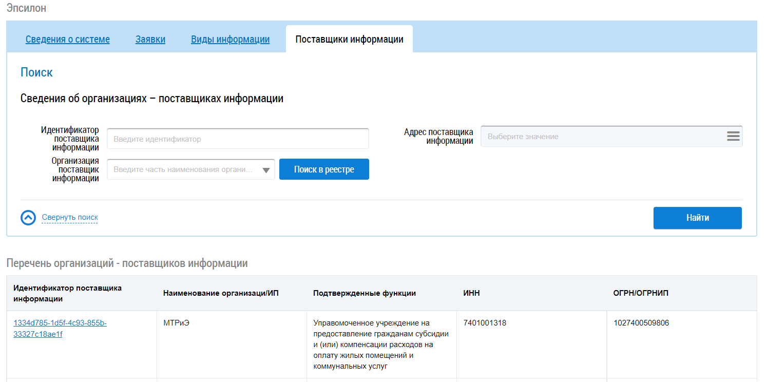 В случае необходимости воспользуйтесь блоком поиска организации. Установите необходимые параметры поиска и нажмите на кнопку Найти. В блоке Перечень организаций-поставщиков информации отобразятся организации, соответствующие поисковому запросу.