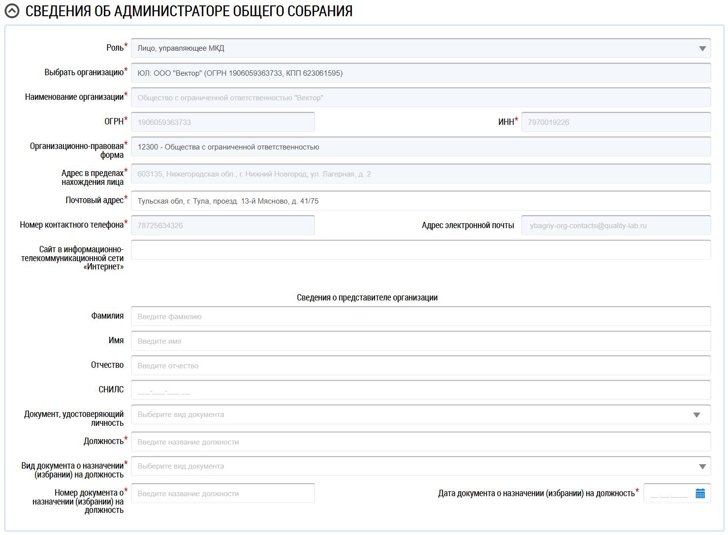 Блок Сведения об администраторе общего собрания отображается в случае, если в выпадающем поле Форма проведения выбрано значение Заочное голосование с использованием системы. Информация об администраторе ОСС заполняется автоматически в зависимости от вашей роли в Системе. Заполните другие обязательные поля, отмеченные звездочкой, необходимыми данными.