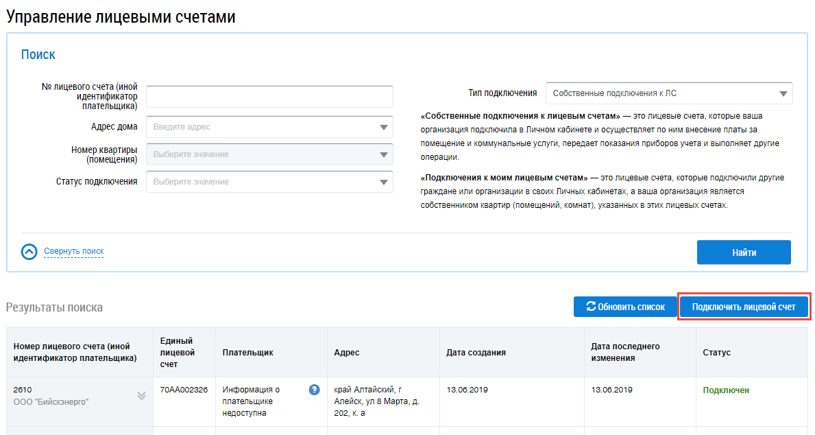 В верхней части страницы отображается блок параметров поиска. В поле Тип подключения по умолчанию отображается Собственные подключения к ЛС, обозначающие данную организацию в качестве плательщика.