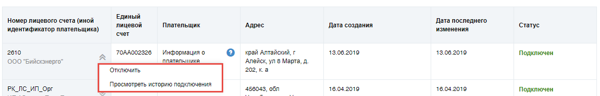 Чтобы отключить подключенный лицевой счет выберите пункт контекстного меню для номера лицевого счета (иного идентификатора плательщика) Отключить. Возможность отключения лицевого счета доступна для собственных подключений к лицевым счетам.