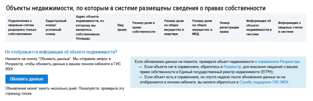 Если информация о собственности не отображается, проверьте актуальность документа, удостоверяющего личность и СНИЛС, а также проверьте наличие корректной информации о собственности в профиле на сайте Росреестра.