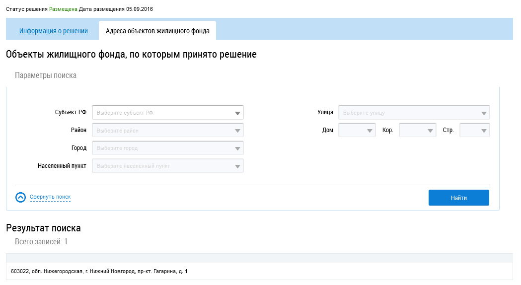 Для просмотра адресов объектов жилищного фонда, по которым принято решение, перейдите на вкладку Адреса объектов жилищного фонда.