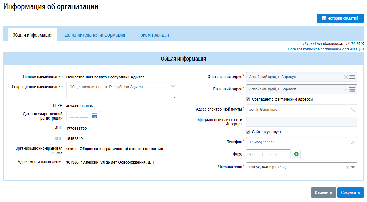 Отображается страница Информация об организации на вкладке Общая информация.