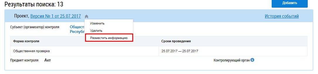 Для размещения в Системе информации о проводимых мероприятиях общественного жилищного контроля и об их результатах в статусе Проект раскройте пункт контекстного меню и выберите Разместить информацию. Подтвердите действие.