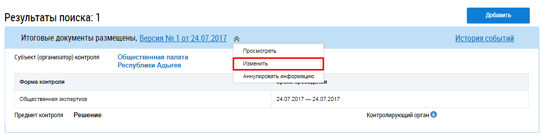 Для изменения информации о проводимых мероприятиях общественного жилищного контроля и об их результатах в статусе Проект и Решение размещено раскройте пункт контекстного меню и выберите Изменить.