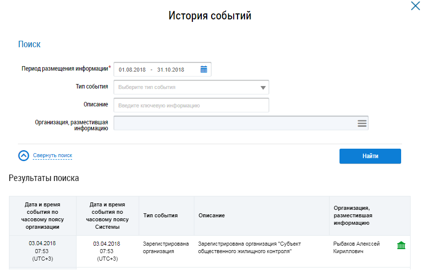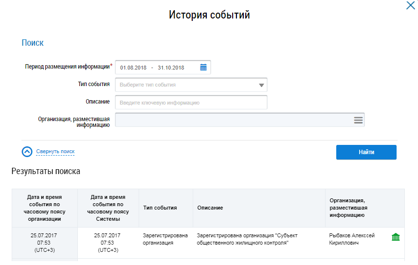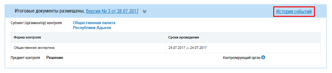 Для просмотра истории событий организации нажмите на кнопку История событий на странице Реестр информации о проводимых мероприятиях общественного жилищного контроля и об их результатах.