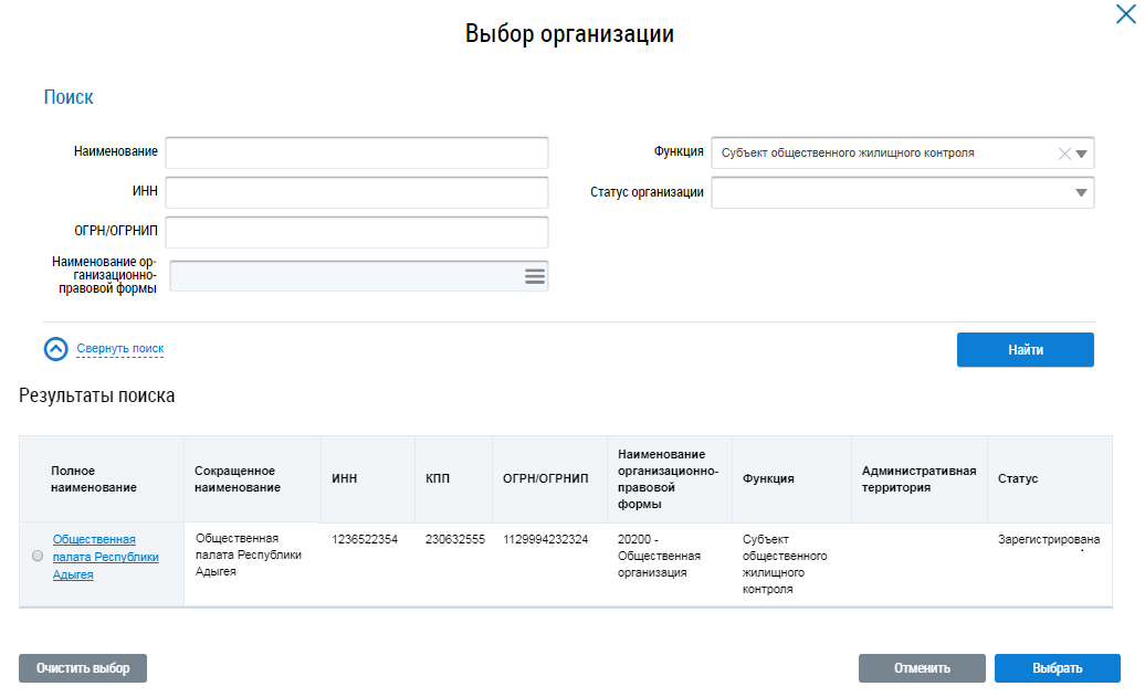 Для поиска организации задайте параметры поиска и нажмите Найти. В блоке результатов поиска выберите нужную организацию, установив переключатель напротив ее наименования. Нажмите кнопку Выбрать.