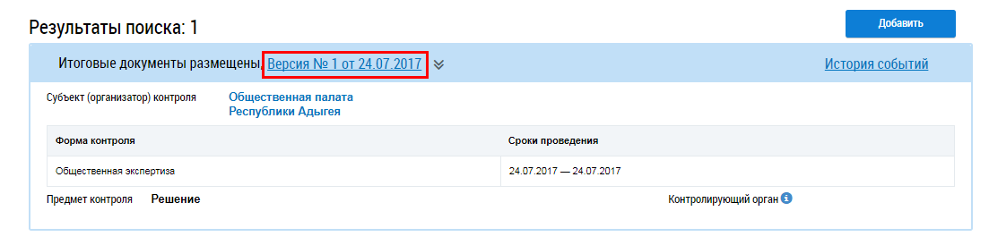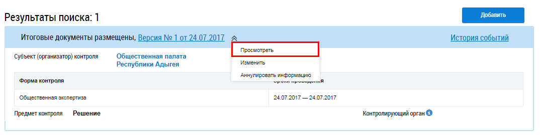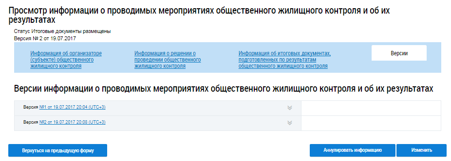 Для просмотра подробной информации о проводимых мероприятиях общественного жилищного контроля и об их результатах нажмите на гиперссылку с номером версии и датой или выберите пункт контекстного меню Просмотреть.