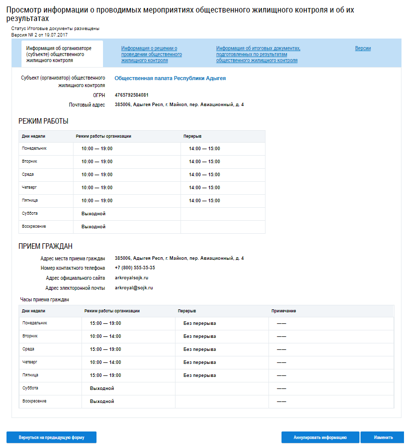 Отображается страница Просмотр информации о проводимых мероприятиях общественного жилищного контроля и об их результатах на вкладке Информация об организаторе (субъекте) общественного жилищного контроля. Вкладка содержит общую информацию об организаторе жилищного контроля, в т.ч. режим работы и время приема граждан.