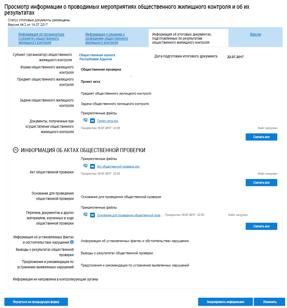 Вкладка Информация об итоговых документах, подготовленных по результатам общественного жилищного контроля доступна для просмотра только при наличии итоговых документов. Для скачивания прикрепленных документов нажмите на гиперссылку с названием документа или на кнопку Скачать все.
