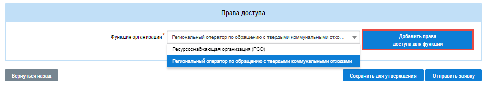 Заполните блок Права доступа. В случае наличия у организации нескольких функций выберите в выпадающем списке поля Функция организации необходимое значение и нажмите на кнопку Добавить права доступа для функции. Если у организации одна функция, данное поле не отображается.