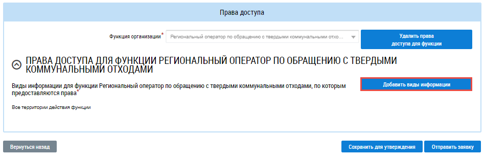 Укажите виды информации, по которым предоставляются права. Для добавления видов информации нажмите на кнопку Добавить виды информации.