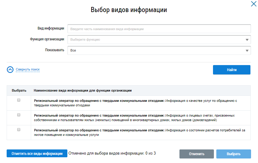 Установите флажки напротив необходимых видов информации или нажмите на кнопку Отметить все виды информации и нажмите на кнопку Выбрать (Окно «Выбор видов информации»).