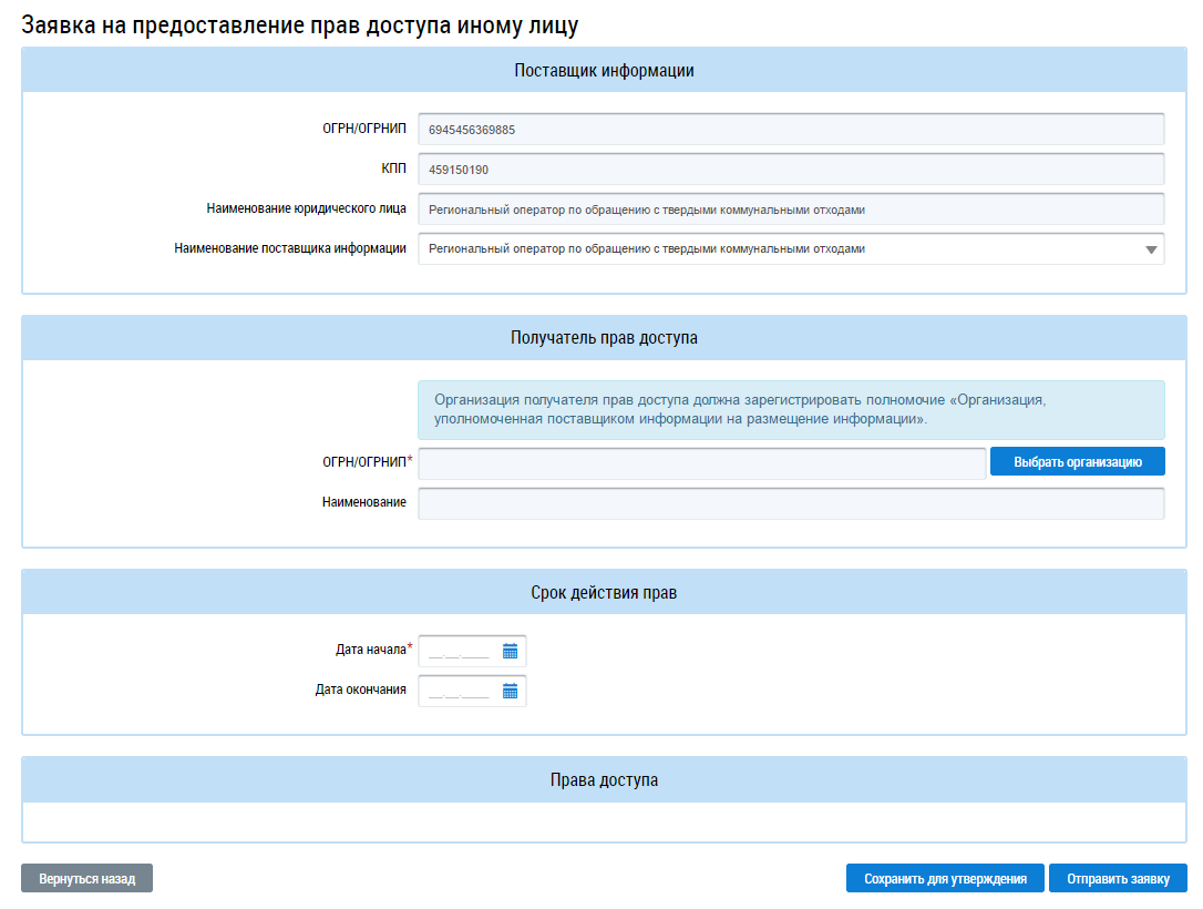 Отображается страница Заявка на предоставление прав доступа иному лицу.