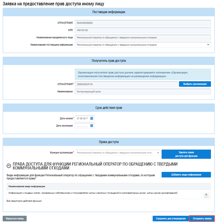 Для отправки заявки получателю прав нажмите на кнопку Отправить заявку (доступно для руководителей организации).
