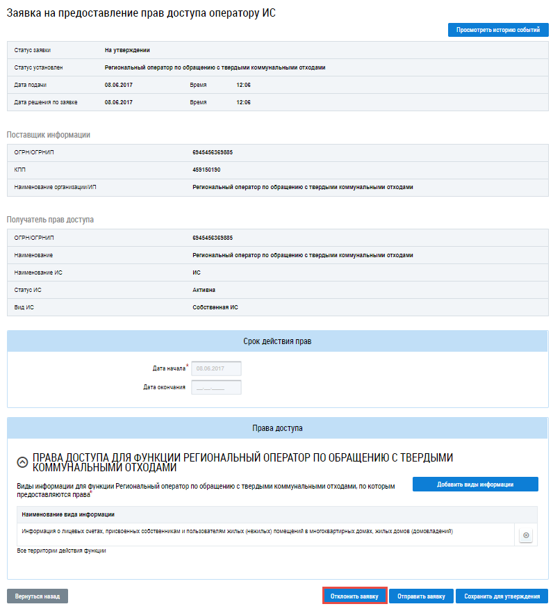 Операция отклонения заявки доступна руководителю организации для заявок в статусе На утверждении и Предзаполнена.