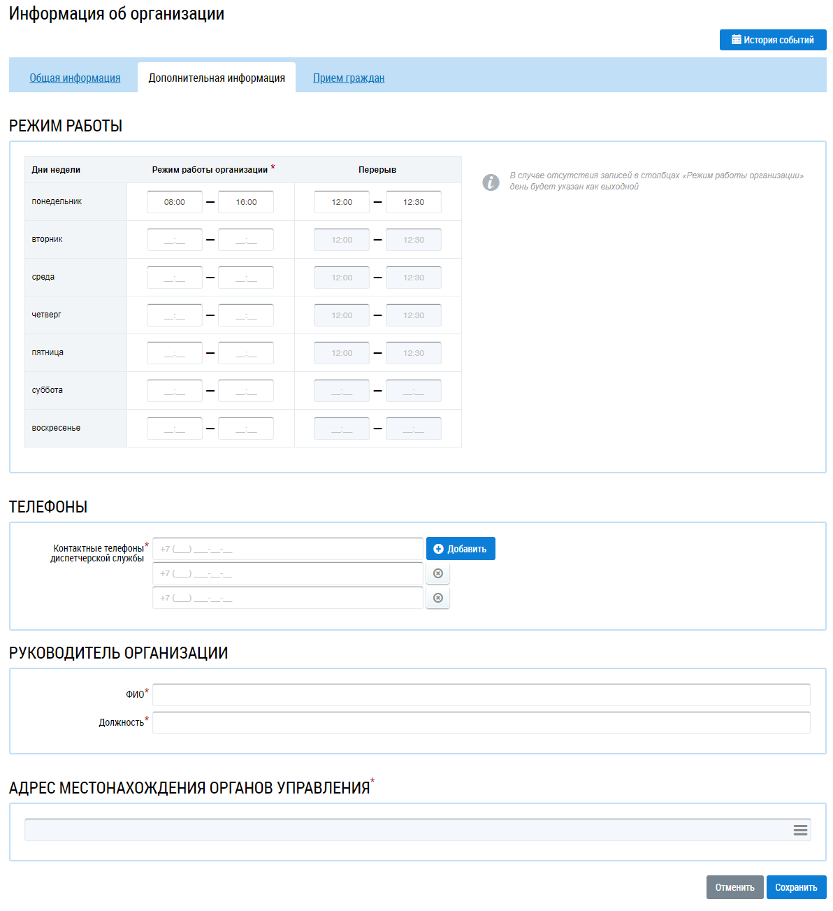 В блоке Режим работы укажите информацию о часах работы и перерывах. В случае отсутствия записей в столбце Режим работы организации день будет указан как выходной.