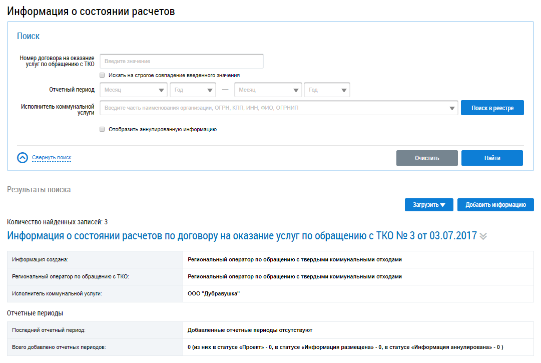 Данный раздел доступен после предоставления представителю организации права доступа «Работа с реестром информации о состоянии расчетов для регионального оператора по обращению с ТКО». Для получения необходимых прав обратитесь к Администратору организации.