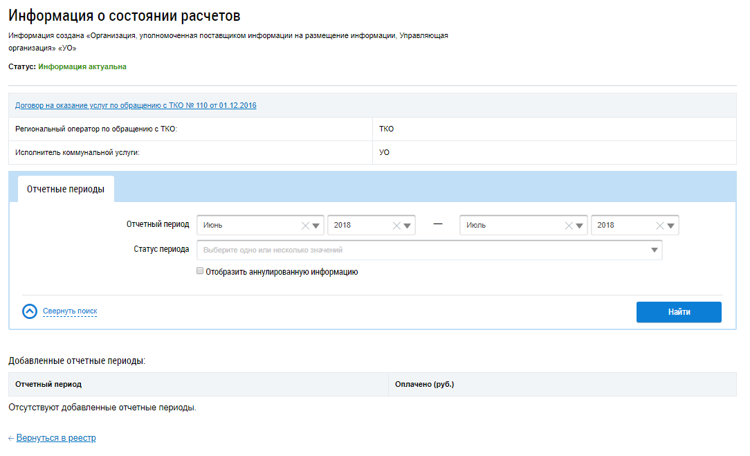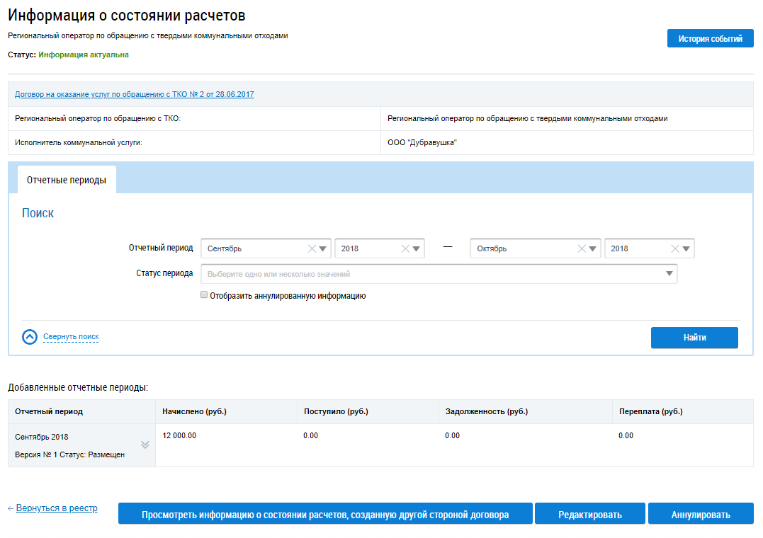 Для просмотра информации о состоянии расчетов, созданную другой стороной договора, нажмите на кнопку Просмотреть информацию о состоянии расчетов, созданную другой стороной договора. Отображается страница Информация о состоянии расчетов.