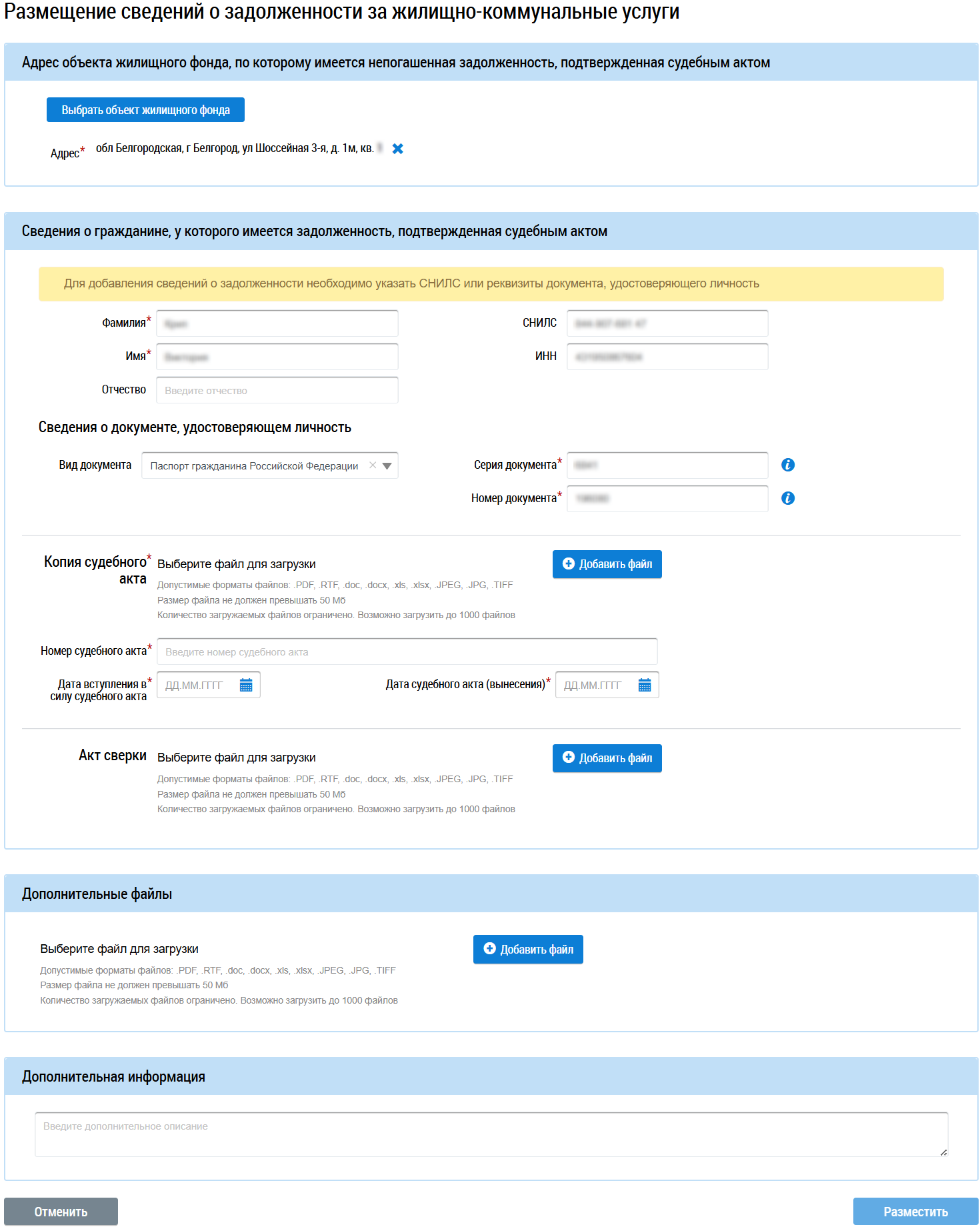 Произойдет переход на страницу размещения сведений о задолженности, поля формы заполнены в соответствии с данными, на основе которых размещаются новые сведения. Заполните поля страницы, при необходимости внесите изменения и нажмите кнопку Разместить.