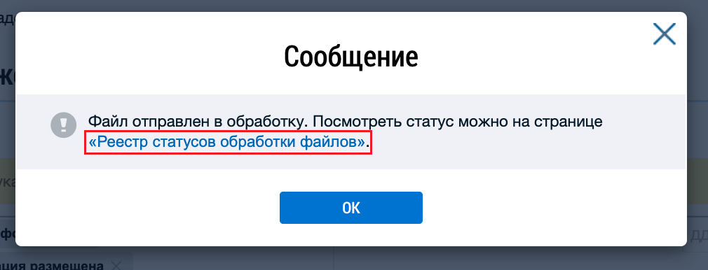 Отображается информационное окно с информацией о начале формирования файла и ссылкой перехода к реестру статусов обработки.