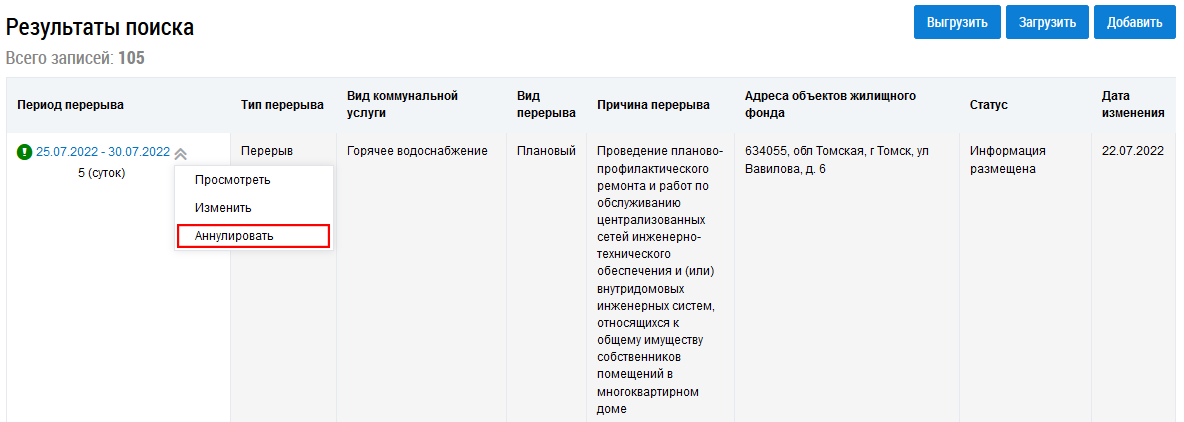 Для аннулирования сведений о перерыве раскройте контекстное меню перерыва в статусе Информация размещена и выберите пункт Аннулировать. Также аннулирование сведений можно инициировать нажатием на кнопку Аннулировать на странице просмотра сведений о перерыве (см. Страница просмотра сведений о перерыве в статусе «Информация размещена»).