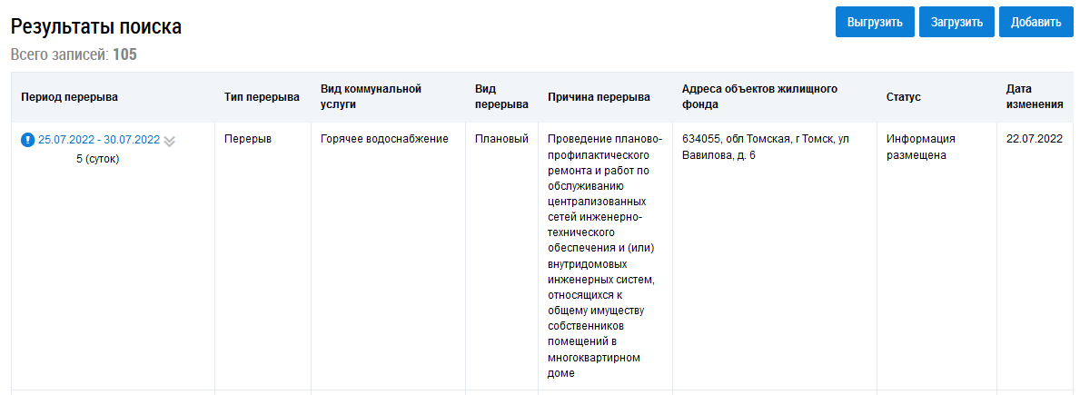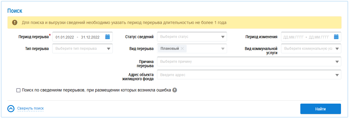 Для заполнения полей Период перерыва и Период изменения укажите интересующие вас диапазоны дат. Для заполнения полей Статус сведений, Тип перерыва, Вид перерыва, Вид коммунальной услуги и Причина перерыва выберите значение из выпадающего списка. Поле Адрес объекта жилищного фонда заполняется вручную. При установке флажка в поле Поиск по сведениям перерывов, при размещении которых возникла ошибка поиск осуществляется по тем сведениям, при размещении которых возникла ошибка, и операция не была выполнена.