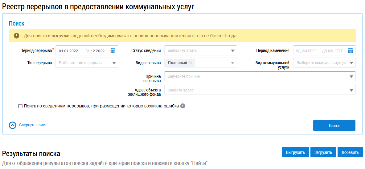 Данный раздел доступен после предоставления представителю организации права доступа «Ведение реестра перерывов в предоставлении коммунальных услуг ». Для получения необходимых прав обратитесь к Администратору организации.