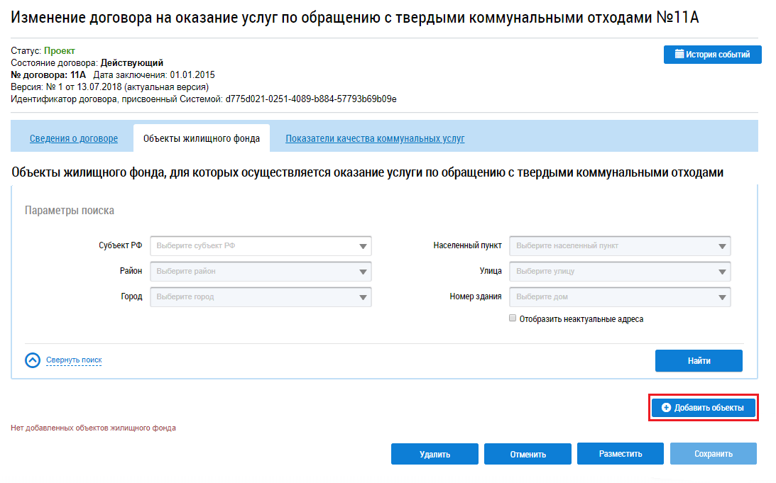 Для размещения договора необходимо добавить хотя бы один объект жилищного фонда, для которого осуществляется оказание услуги по обращению с твердыми коммунальными отходами. Для этого перейдите на вкладку Объекты жилищного фонда и нажмите на кнопку Добавить объекты.