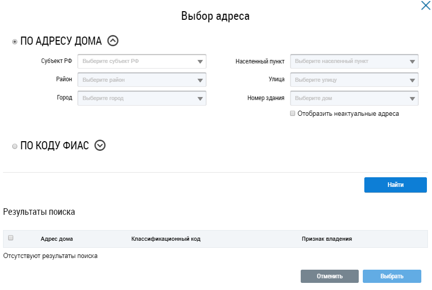 Поиск дома возможен по адресу дома и по коду ФИАС. Заполните поля адреса дома, выбирая значения из выпадающих списков. Впишите в поле Классификационный код код ФИАС. Нажмите на кнопку Найти.