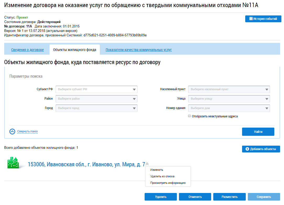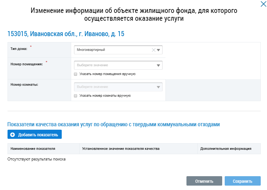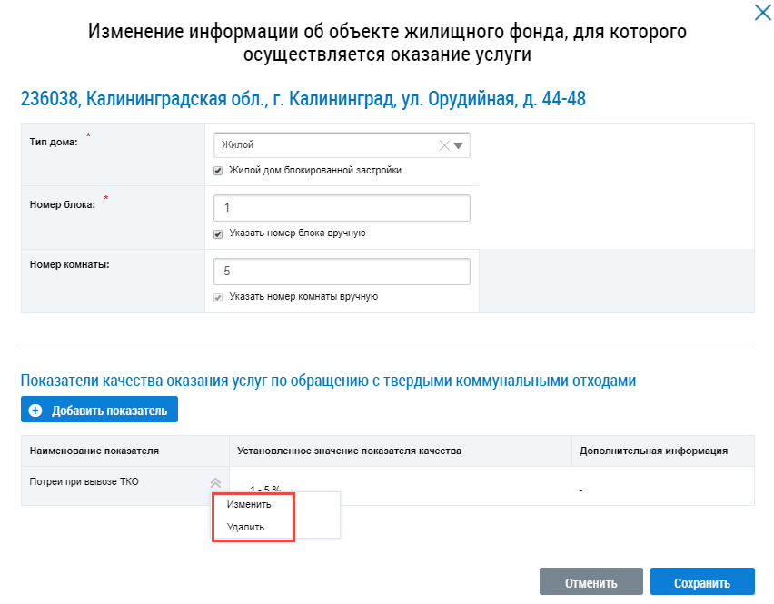 Отображается окно Изменение информации об объекте жилищного фонда, для которого осуществляется оказание услуги.